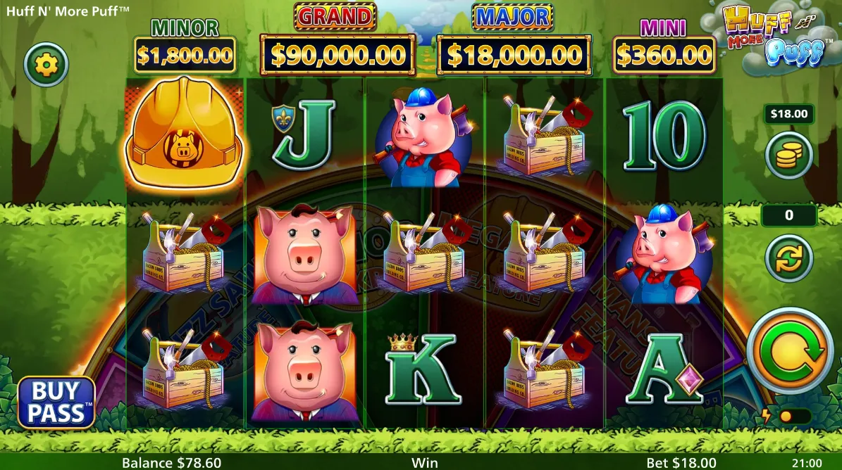 Huff N' More Puff draws its inspiration from the timeless tale of the Three Little Pigs, and Light & Wonder have brought this classic story to life with vibrant visuals and playful animation. The game’s backdrop features a sunlit countryside dotted with charming houses made of straw, sticks, and bricks, instantly immersing players in a fairytale world. Each symbol is carefully crafted to match the theme, with the pig characters, construction hats, and the iconic Big Bad Wolf all rendered in a colorful, cartoon style. Players who want to explore the game risk-free can try it through Free Demo Slots versions available online.