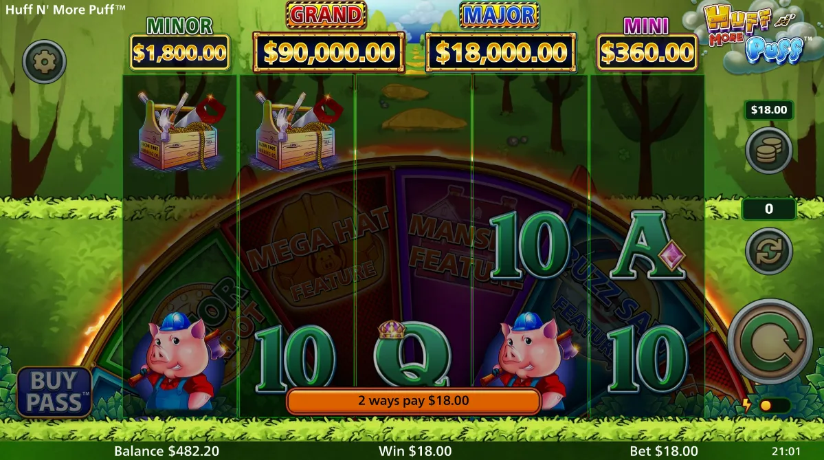 The Mansion Feature is the pinnacle of Huff N' More Puff’s bonus offerings. This round is typically accessed via the Buzz Saw Wheel and starts with all framed positions on the reels as brick houses-the highest upgrade possible. This setup dramatically increases the potential for top-tier prizes, including the Major and Grand jackpots.