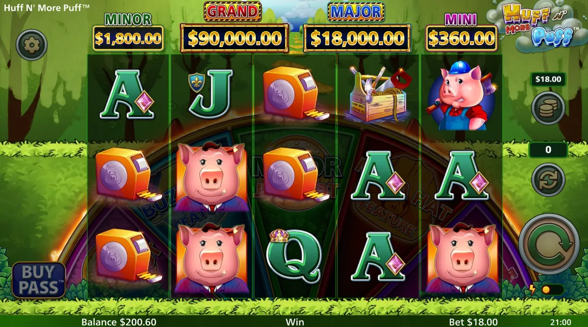 Huff N' More Puff offers players the chance to score significant wins, with a maximum payout of up to 5,500 times the bet in a single spin. This top prize can typically be achieved during the Mansion Feature, especially when players land a full screen of upgraded brick houses, which can reveal instant cash prizes or jackpot tokens. In real-world play, there have been documented wins exceeding $200,000, particularly when playing at high stakes and triggering the game's most lucrative bonus rounds.
